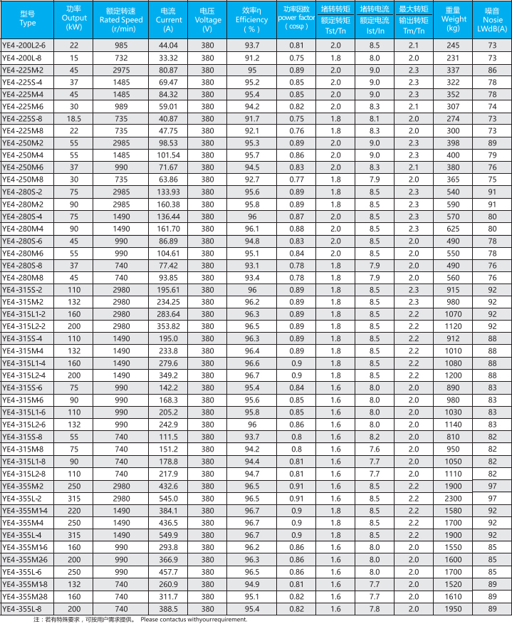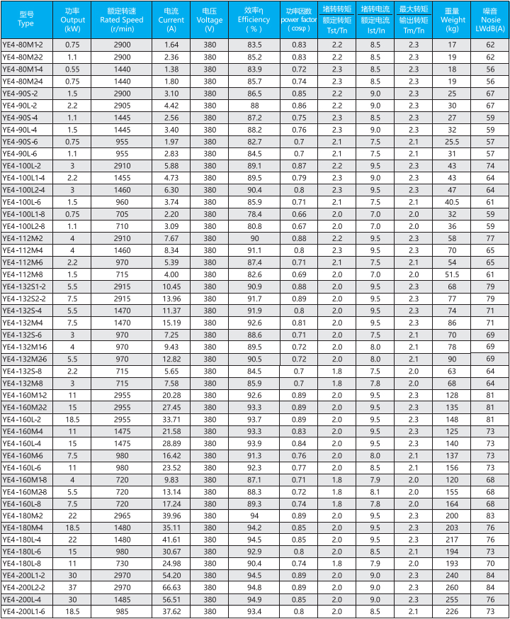 YE4系列(中心高H80-355mm、0.55-375kW)電動(dòng)機(jī)是全封閉、自扇風(fēng)冷式鼠籠型三相異步電動(dòng)機(jī),產(chǎn)品能效與IEC60034-30的IE4保持一致。一般電壓為380V、頻率為50HZ也可按客戶要求定制。工作環(huán)境-15-40℃海拔不超過(guò)1000m,絕緣等級(jí)F(B極考核)、防護(hù)等級(jí)IP55、冷卻方式IC411、工作制S1、安裝方式符合IEC和DIN標(biāo)準(zhǔn)。YE4系列電動(dòng)機(jī)為一般用途的電動(dòng)機(jī),適用于驅(qū)動(dòng)無(wú)特殊要求的各種機(jī)械設(shè)備。YE4系列電動(dòng)機(jī)滿足GB18613-2020能效限值2級(jí)。