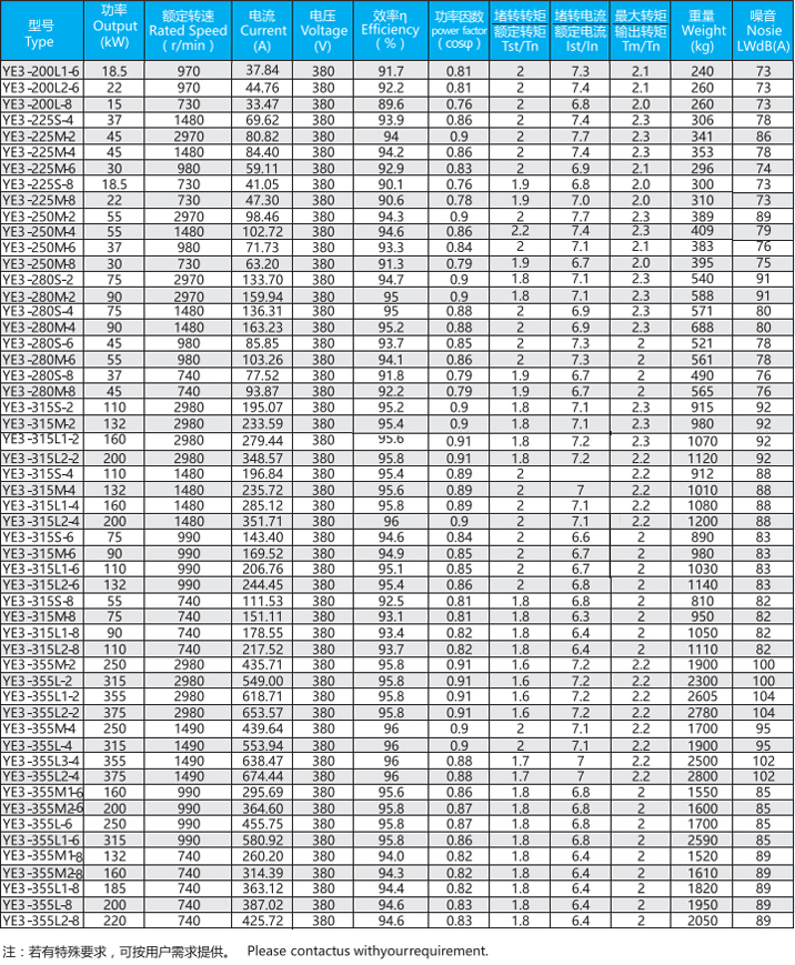 YE3系列(中心高H80-355mm、0.55-375kw)電動(dòng)機(jī)是全封閉、自扇風(fēng)冷式鼠籠型三相異步電動(dòng)機(jī),產(chǎn)品能效與EC60034-30的IE3保持一致。一般電壓為380V、頻率為50Hz也可按客戶要求定制。工作環(huán)境-15-40°C,海拔不超過(guò)1000M,絕緣等級(jí)F(B極考核)防護(hù)等級(jí)IP55、冷卻方式IC411、工作制S1、安裝方式符合IEC和DIN標(biāo)準(zhǔn)。